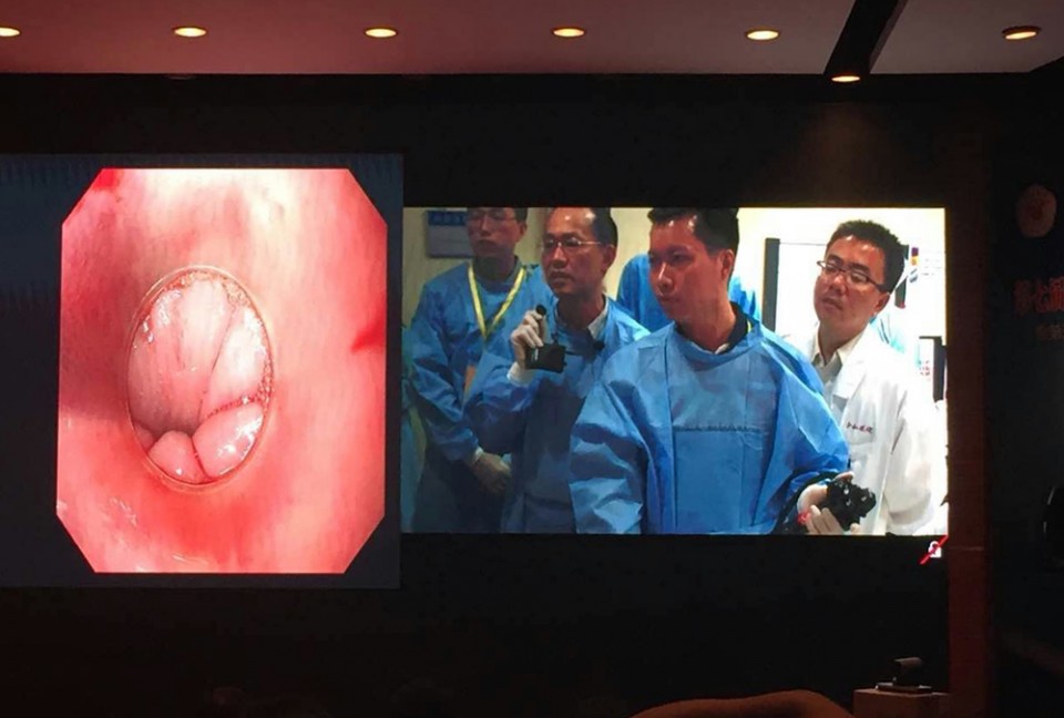 近日,在上海举办的第7届食管胃静脉曲张学术交流会上,我院消化科孔德润教授应邀担任“手把手”教学专家,并作大会演示操作。3天时间里,孔德润教授不仅演示了食管曲张静脉的内镜下多环套扎、透明帽辅助硬化剂及“新三明治”组织胶治疗技术,还指导了10余名学员的内镜治疗学习。尤其是演示了精准内镜硬化治疗技术(ESVD),在贲门下方从血管源头上处理食管胃静脉曲张,不仅可以提高单次治疗效果,还可以大大减少并发症的产生,减少治疗次数,使患者在短时间内可以达到根除或基本根除曲张静脉的疗效。