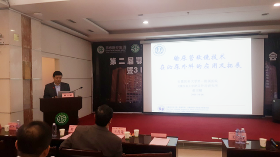 第二届鄂赣皖三省微创泌尿外科学术会议暨3D腹腔镜在泌尿外科应用学习班于10月16日在湖北黄石中心医院召开,我院泌尿外科郝宗耀副教授应邀参加并做“输尿管软镜技术在泌尿外科的应用”的学术报告及输尿管软镜碎石术的手术演示。术者同时合并输尿管及肾脏下盏多发结石,但凭借着娴熟的操作技术,在30分钟内顺利完成了手术。