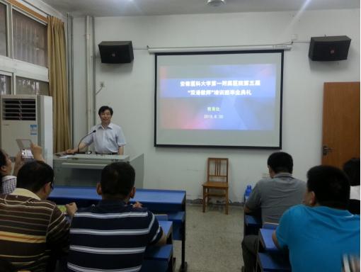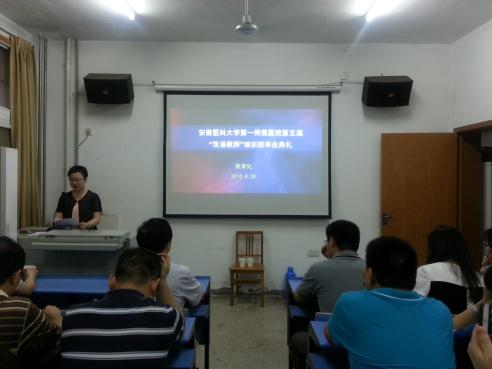 6月30日晚,我院第五届双语教师培训班毕业典礼在临床教学科研楼1楼多媒体教室举行。公共基础学院朱梅福院长、国际教育学院副院长黄华兴,外语 系汪媛主任、教育处副处长刘虹等相关领导和负责人出席典礼。各临床学科教研室近30名学员参加了毕业典礼。毕业典礼由教育处教务科副科长高敏主持。