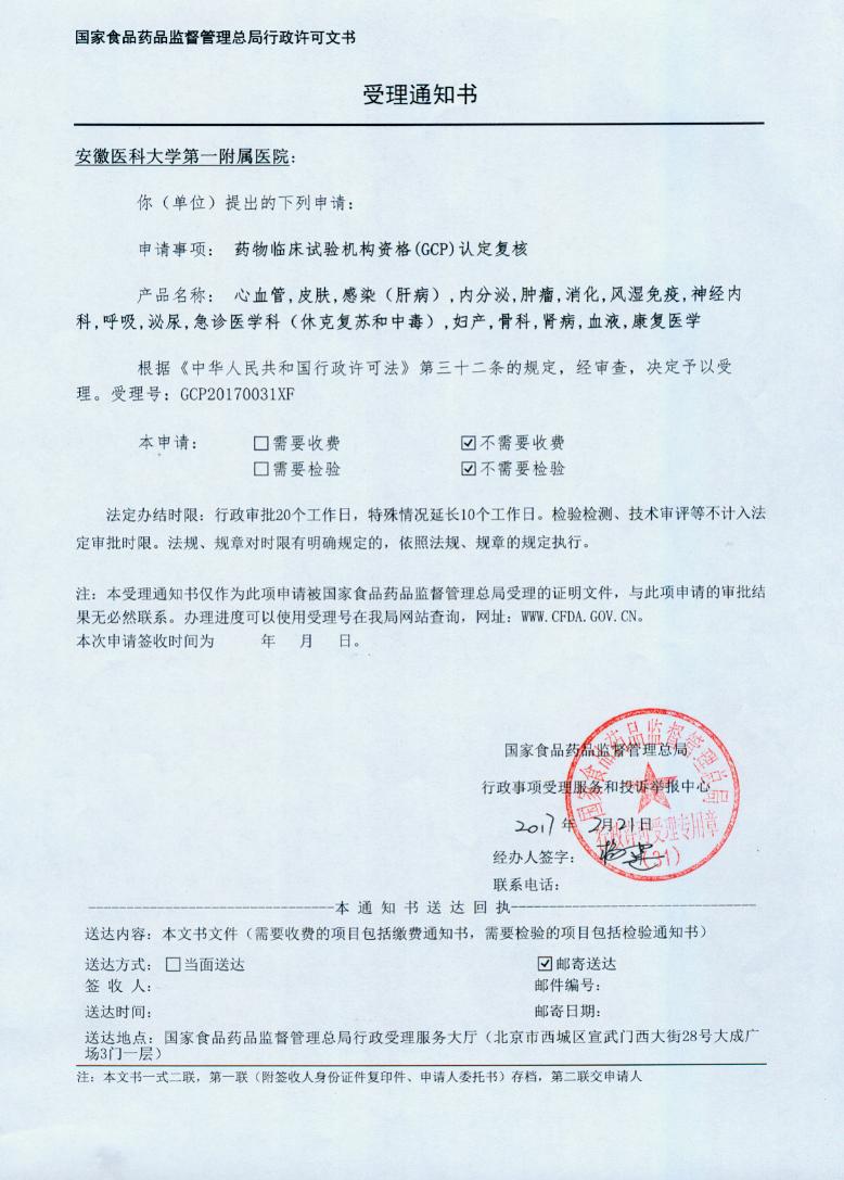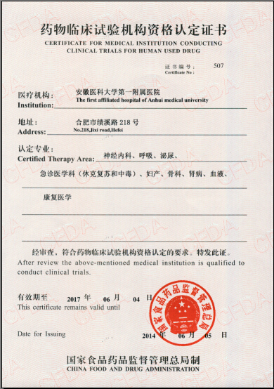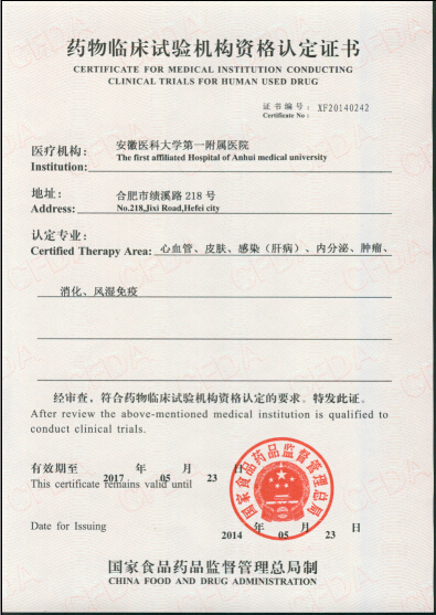 1999年经国家药品监督管理局认定,我院被批准为国家药品临床研究基地,批准专业有免疫、消化、内分泌。2000年新增感染(肝病)、肿瘤专业。2010年7月经SFDA复核后,获“国家药物临床试验机构”资格,认证专业点7个,包括心血管、皮肤、感染(肝病)、内分泌、肿瘤、消化、风湿免疫。2014年6月经CFDA复核和新专业点资格认证,获“国家药物临床试验机构”资格认证专业点16个,包括心血管、皮肤、感染(肝病)、内分泌、肿瘤、消化、风湿免疫、神经内科、呼吸、泌尿、急诊医学科(休克复苏和中毒)、妇产、骨科、肾病、血液、康复医学。2020年7月完成药物临床试验机构备案管理信息平台备案,备案专业16个,包括内科-呼吸内科专业、内科-消化内科专业、内科-神经内科专业、内科-心血管内科专业、内科-血液内科专业、内科-肾病学专业、内科-内分泌专业、内科-其他-风湿免疫科、外科-骨科专业、外科-泌尿外科专业、妇产科-生殖健康与不孕症专业、皮肤科-皮肤病专业、传染科-其他-肝病感染科、肿瘤科、急诊医学科、康复医学科。