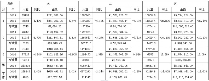说明:2014年3月份供暖延长六天,3月份蒸汽用量上升15.58%。