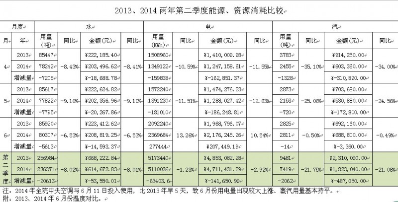 2013、2014两年第二季度能源、资源消耗比较