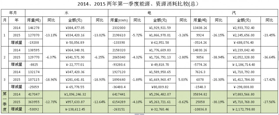 2014、2015两年第一季度能源、资源消耗比较(总)