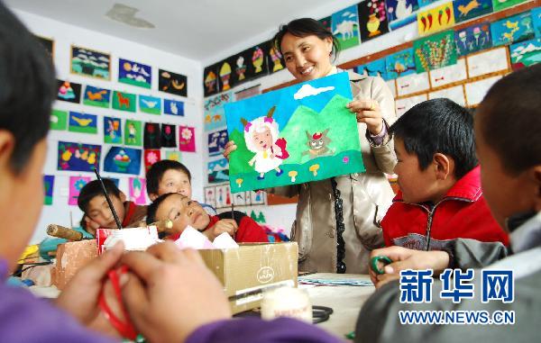 青海省黄南藏族自治州同仁县年都乎小学艺术教师卓嘎吉在给学生讲授堆绣制作技艺(2010年3月17日摄)。在热贡艺术发祥地青海省黄南藏族自治州同仁县隆务河畔,当地政府为了更好地保护和传承热贡艺术,在95%以上的中小学校设立了热贡艺术课。学生可在专业热贡艺术教师的指导下系统地学习唐卡、堆绣等技艺。新华社记者张宏祥摄