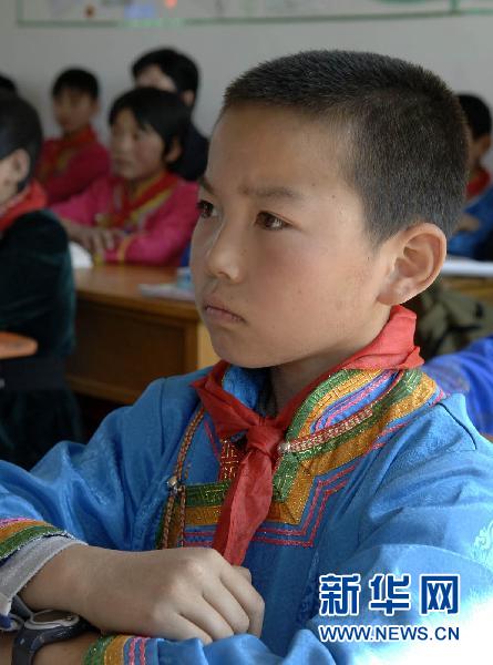2006年5月26日,勿布林蒙古族学生扎木苏在专心听课。勿布林是我国一个位于科尔沁草原深处、中蒙两国边境地区的乡镇。当地政府在勿布林投资修建勿布林蒙古族小学,既解决了勿布林蒙古族孩子上学远、上学难的问题,又使全乡的所有儿童得以免费接受蒙古语和汉语双语教育。新华社记者李欣摄