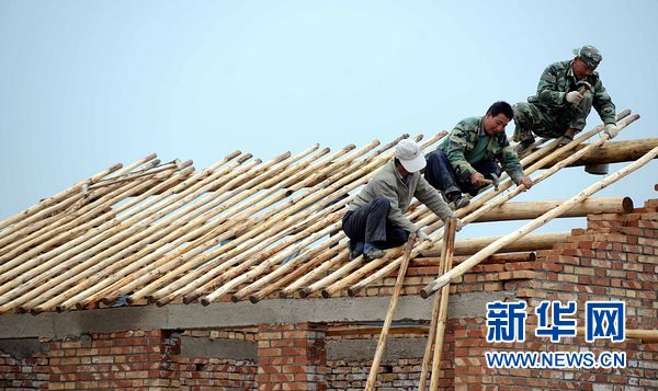 在宁夏固原市原州区三营移民新村,几位村民在盖新房(2008年9月7日摄)。