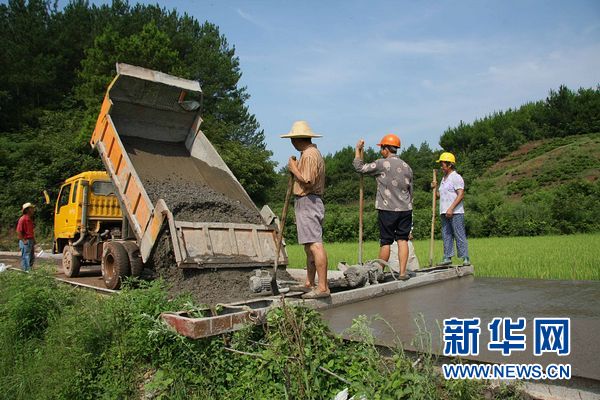筑路工人在浇注通往安徽休宁县万安镇福寺村的水泥路(2008年7月23日摄)。