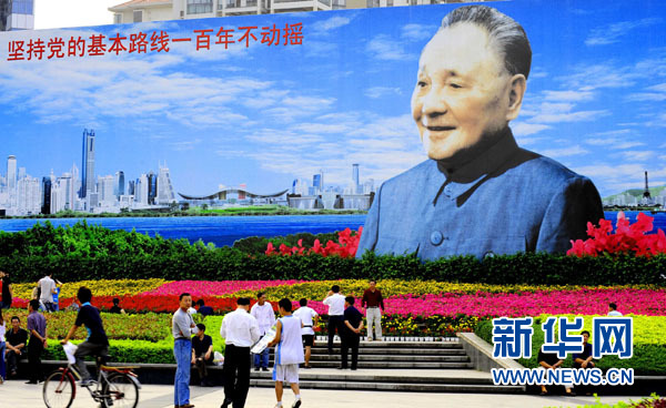 资料图:2008年10月14日,市民在深圳市深南大道旁的邓小平画像前广场上休闲。新华社发