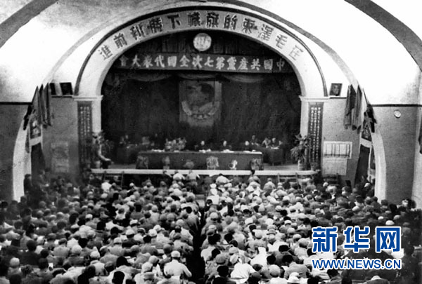 毛泽东、朱德在中国共产党第七次全国代表大会主席台上(资料照片)。1945年4月23日至6月11日,中国共产党第七次全国代表大会在陕北小山村——杨家岭召开。毛泽东在会上致开幕词和闭幕词,并作了《论联合政府》的政治报告。七大确定了党的政治路线,确立毛泽东思想为党的指导思想并写入党章。七大总结中国新民主主义革命20多年曲折发展的历史经验,克服党内的错误思想,使全党特别是党的高级干部对中国民主革命的发展规律有了比较明确的认识。它为党领导人民去争取抗日战争的胜利和新民主主义革命在全国的胜利,奠定了政治上、思想上和组织上的深厚基础。新华社发