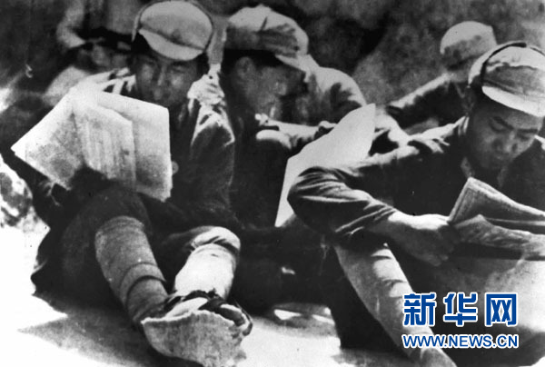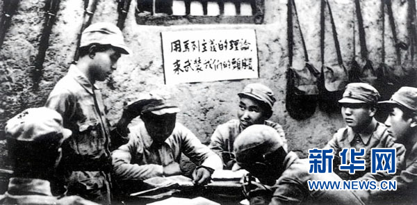 这是战士们在进行整风学习(资料照片)。1945年4月23日至6月11日,中国共产党第七次全国代表大会在陕北小山村——杨家岭召开。毛泽东在会上致开幕词和闭幕词,并作了《论联合政府》的政治报告。七大确定了党的政治路线,确立毛泽东思想为党的指导思想并写入党章。七大总结中国新民主主义革命20多年曲折发展的历史经验,克服党内的错误思想,使全党特别是党的高级干部对中国民主革命的发展规律有了比较明确的认识。它为党领导人民去争取抗日战争的胜利和新民主主义革命在全国的胜利,奠定了政治上、思想上和组织上的深厚基础。新华社发