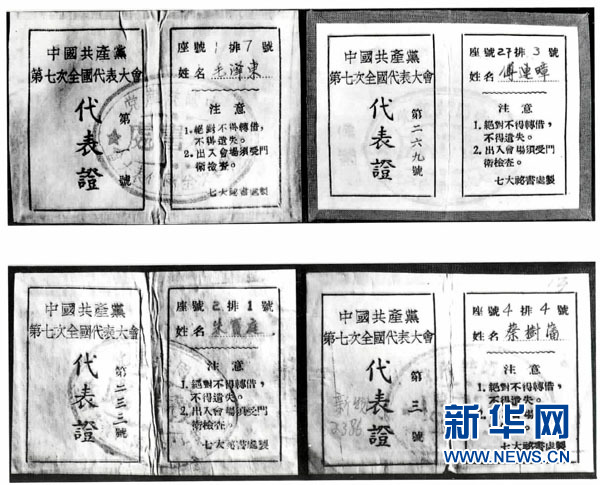 这是中共“七大”代表毛泽东等人的代表证(资料照片)。1945年4月23日至6月11日,中国共产党第七次全国代表大会在陕北小山村——杨家岭召开。毛泽东在会上致开幕词和闭幕词,并作了《论联合政府》的政治报告。七大确定了党的政治路线,确立毛泽东思想为党的指导思想并写入党章。七大总结中国新民主主义革命20多年曲折发展的历史经验,克服党内的错误思想,使全党特别是党的高级干部对中国民主革命的发展规律有了比较明确的认识。它为党领导人民去争取抗日战争的胜利和新民主主义革命在全国的胜利,奠定了政治上、思想上和组织上的深厚基础。新华社发