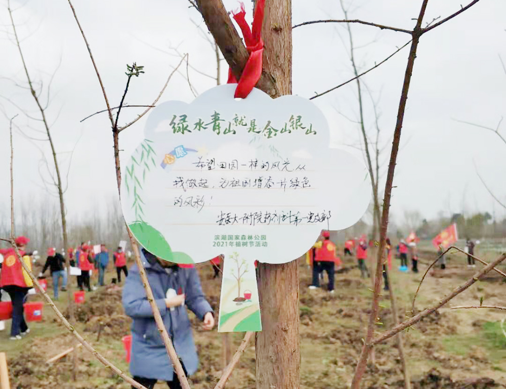 支部书记高昌琨在接受合肥广播电视台记者的采访时说,滨湖森林公园的空气清新,景色秀丽,令人心旷神怡,现在合肥的树木和绿地越来越多,每年蓝天的天数也越来越多,水越来越清,生态环境的改善离不开我们每个人的共同参与,今天我们参加义务植树活动,就是以实际行动来为合肥添绿,为党旗增彩。