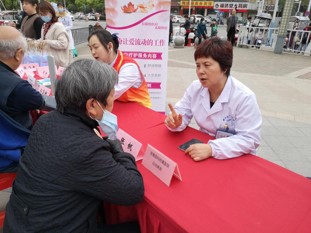 多学科联合线下系列活动在合肥市蜀山区清溪路社区开展,参加的专家有安徽省肿瘤防治办公室徐辉副主任医师、安医大一附院日间病房张帆主任医师、张海燕护士长、刘浩梅主管护师、王肖影和孙芷娴护师,肿瘤放疗科吴黎明副主任医师、杜华护士长、叶阳阳护士长、罗薇薇主治医师,肿瘤内科郝吉庆主任医师、笪洁副主任医师、李峰护士长、柴玉玲专科护士,中西医结合肿瘤科张峰利副主任医师等。活动第一站在清溪路社区党群服务中心会议室,日间病房“向日葵之家”开展的“乳”此美丽系列专项活动正式拉开序幕,由日间病房刘浩梅主管护师、肿瘤内科柴玉玲主管护师分别授课,现场专家给予答疑解惑,社区居民足不出户获得了专业的医疗护理知识,赢得了大家的一致赞誉;活动第二站在元祥广场开展咨询公益活动,专家们对前来问诊的百姓一一给予耐心解答和初步诊断,各个健康服务台前均人头攒动,气氛火爆;活动第三站专家一行到蜀山区医健新安养老院,慰问关怀老人,提供专业照护,现场温馨感动,获得了老人们的肯定与赞扬。