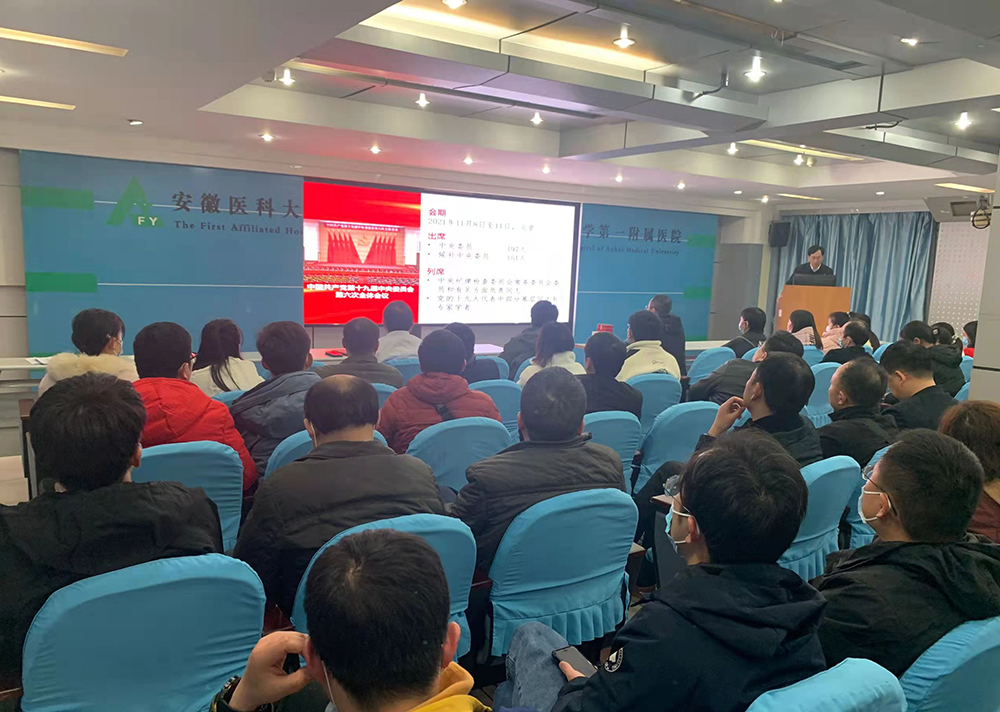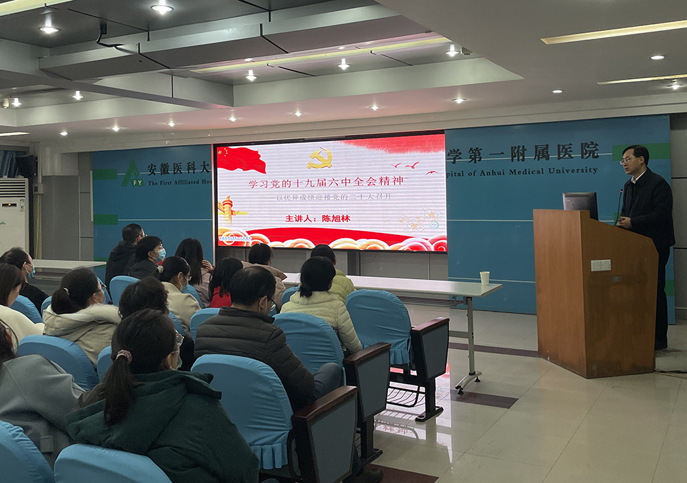12月16日晚7点,副院长陈旭林在实验中心楼六楼会议室由为药剂科第一、第二党支部全体党员讲授“学习贯彻党的十九届六中全会精神”专题党课。