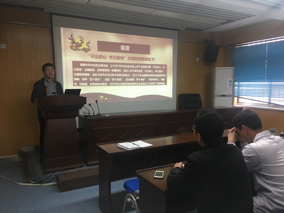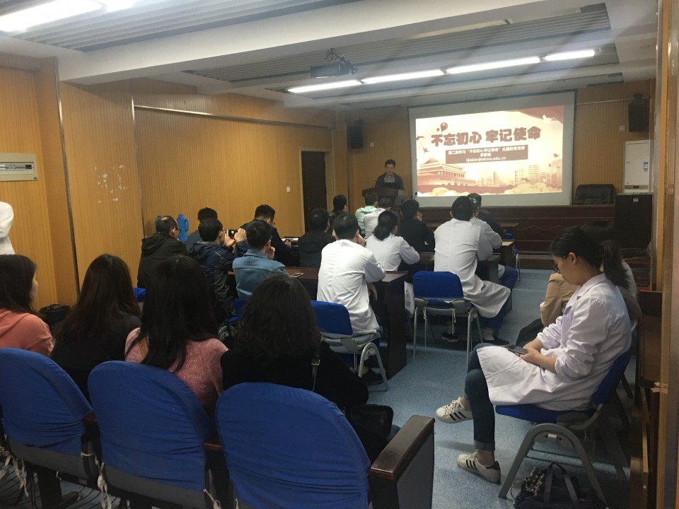 10月25日下午,常务副院长李家斌在行政楼3楼会议室为感染科、麻醉科党支部上主题教育专题党课。