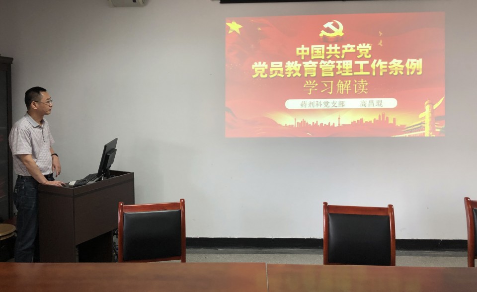 6月26日下午,药剂科党支部在中心实验室三楼会议室组织了专题党课学习,支部副书记高昌琨同志为大家上了一堂题为《中国共产党党员教育管理工作条例(学习解读)》的党课。高昌琨对全体上课人员全面解读了《中国共产党党员教育管理工作条例》的具体细则,结合药剂科党员教育管理工作强调:支部全体党员要加强对《条例》的具体内容及其他条例法规的政治理论学习的积极性和主动性,每位党员都要以党章要求和《条例》规定,接受党组织的教育管理。