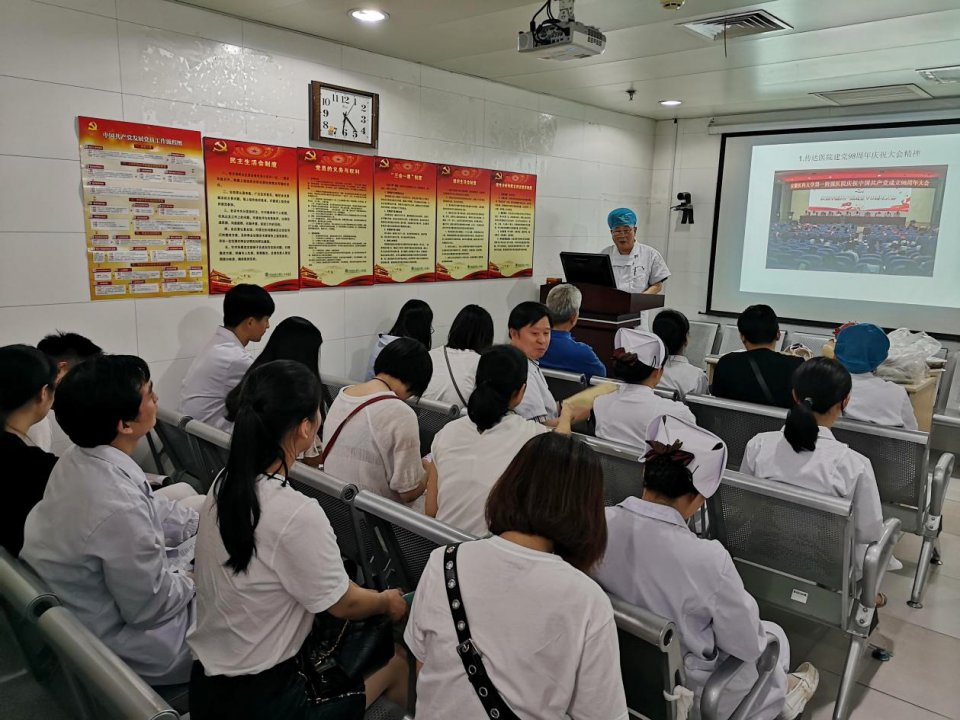 会议传达了医院建党98周年庆祝大会精神、院党〔2019〕28号《关于开展庆祝建党98周年“七个一”活动的通知》、院党〔2019〕21号《关于2019年全院政治理论学习的安排意见》、院党〔2019〕30号《关于开展“庆祝建党98周年”优秀党支部文化墙评选活动的通知》。并组织学习了《中国共产党党员教育管理工作条例》。