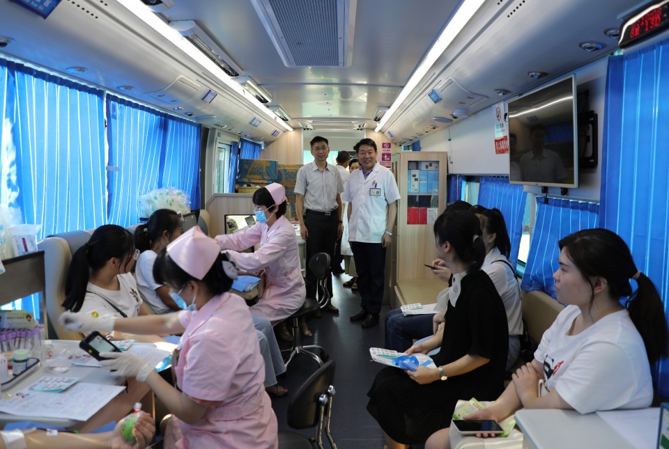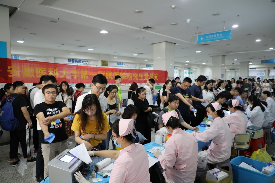 为弘扬“医者仁心”的大爱精神,以实际行动践行社会主义核心价值观,缓解临床用血紧张的局面。研究生党总支于8月13日组织我院研究生开展专场义务献血。上午7点,近300名硕、博士研究生和住培学员准时汇集到内科医技楼一楼大厅,井然有序地排队填表、体检并等待献血。医院领导高度重视本次义务献血活动,副院长费广鹤和党委副书记戴晓支等一早便来到现场亲切看望和慰问同学们。据了解,很多研究生党员已经连续多次参加义务献血。献血现场出现了一幕幕感人的画面,很多同学刚刚拔出针头,就按着胳膊,又奔向门诊、病房或高新医院的临床工作中;不少同学主动要求增加献血量,200ml不够加到300ml还是不满意,一直再加到一次献血的最大限量400ml……。从早晨一直延续到下午,经过体检合格后有两百余名研究生进行了无偿献血,其中有16名同学献血300ml,5名同学献血400ml,总血量达42500ml,大大缓解了合肥市中心血站的夏季“血荒”。