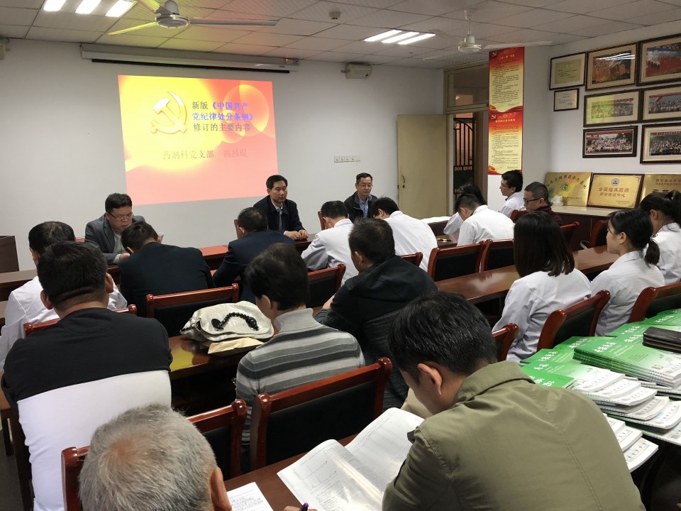 10月24日下午五点,在院中心实验楼三楼会议室,药剂科党支部组织了例行的十月份政治学习,党支部书记贾德武同志主持此次学习。首先宣传委员宫鹏同志带领大家认真学习了习近平总书记有关《习近平论人类命运共同体》的讲话论述摘编,接着由党支部副书记高昌琨同志为党员同志们上了一堂名为“新版《中国共产党纪律处分条例》修订的主要内容”的党课。最后,贾德武书记再次要求全体党员同志要讲党的纪律,遵守国家法律,不碰政治红线,做一名合格的共产党员。