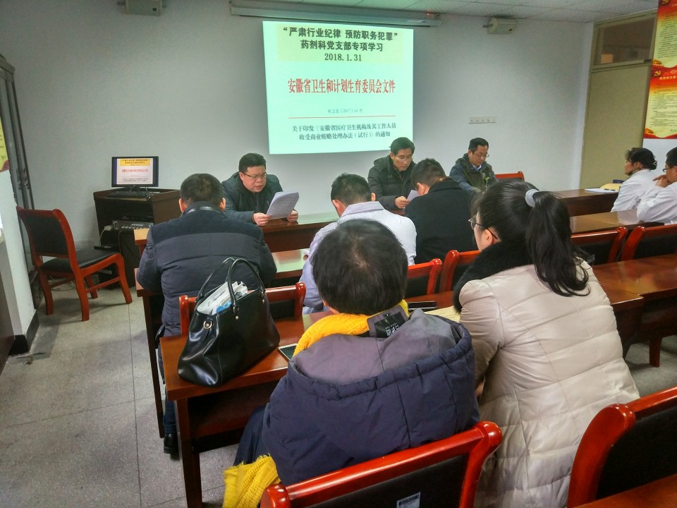 首先有宣传委员宫鹏同志带领党员们学习了皖卫医【2017】61号《关于印发【安徽省医疗卫生机构及其工作人员收受商业贿赂处理办法(试行)】》的通知,随后党支部书记贾德武同志就支部2017年的工作向全体党员进行了总结汇报。接着党支部副书记高昌琨同志传达了院《关于加强基层党支部建设的若干意见(试行)》及院党【2018】4号《关于组织召开2017年度组织生活会和开展民主评议党员的通知》两个重要文件,并带领党员们一起学习了“党的十九届二中全会公报”速读专题报告。党员们通过系统学习增强了党性的自觉性、坚定性,深刻领会党要管党、从严治党治党的重要性。最后贾书记强调了一系列文件学习并认真贯彻执行的重要性,并再次强调了学习纪律! (药剂科党支部 谢宏永)