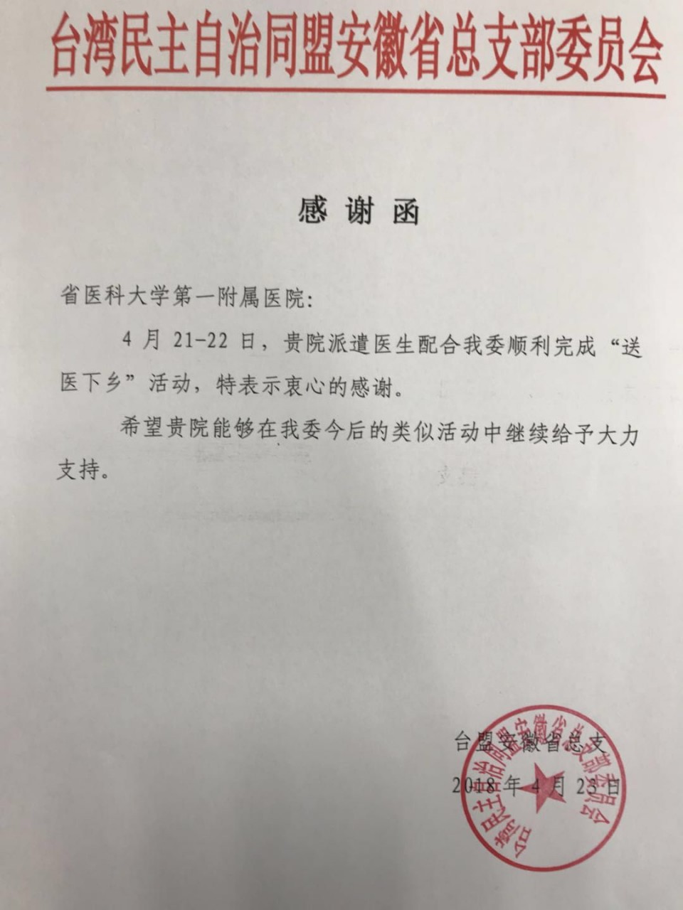 4月21日至22日,安徽省台联、安徽台盟总支、安徽省粮食局在蒙城县共同举办送医下乡义诊活动。省台联会长、省台盟主委陈清海,省粮食局副局长马三九,省台联副会长、省台盟副主委林敏,省台盟副主委陈伟旭和蒙城县委常委、副县长罗立高到现场参加活动。义诊活动先后在蒙城县许疃镇、庄周办事处九里桥村进行。来自安徽医科大学第一附属医院、芜湖弋矶山医院、蚌埠第二人民医院等医院的 15名专家免费为当地群众提供了内分泌、糖尿病、心电心功能、心血管内科、冠心病专科、神经内科及脑梗专科、脑卒中专科、风湿免疫、内科、儿科、口腔科、骨科等专科医疗服务,并为相关群众进行了心血管彩超、心电图检查以及血糖检测、血压测量。
