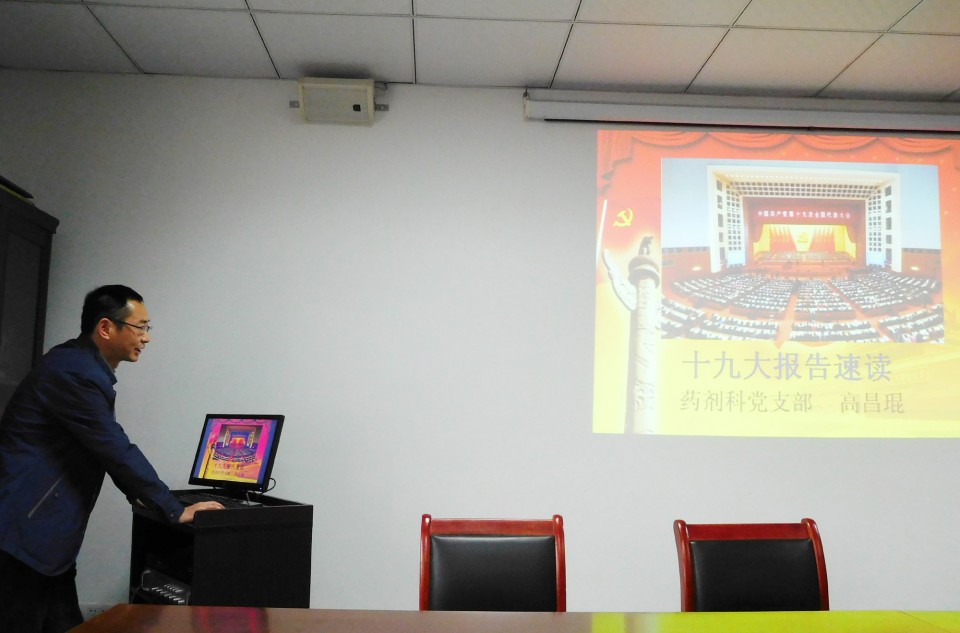 10月25日医院药剂科党支部在实验中心楼三楼会议室组织全体党员进行了十月份政治学习,党支部副书记高昌琨同志给党员们作了“十九大报告速读”专题报告。高书记从大会主题、十个方面历史性成就、两个重大判断、五个定位等多方面进行了详实的解读,使党员们对中国共产党第十九次全国代表大会,是在全面建成小康社会决胜阶段、中国特色社会主义进入新时代的关键时期召开的一次十分重要的大会有了更深刻的认识,把全体党员思想认识统一到党中央的部署上来,踏实工作,用优异的成绩献礼十九大的胜利召开。