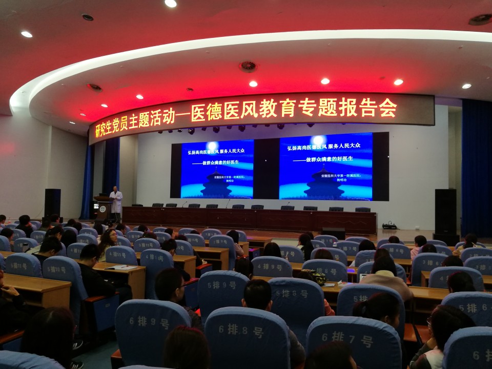 为进一步加强医德医风建设,提高研究生党员医疗服务质量和职业道德素质,11月16日下午,研究生党总支特邀请我院杨明功老教授在会议中心作了一场题为“弘扬高尚医德医风,服务人民大众——做群众满意的好医生”专题报告,近300名研究生党员到场聆听,会议由研究生党总支书记赵嘉芸主持。