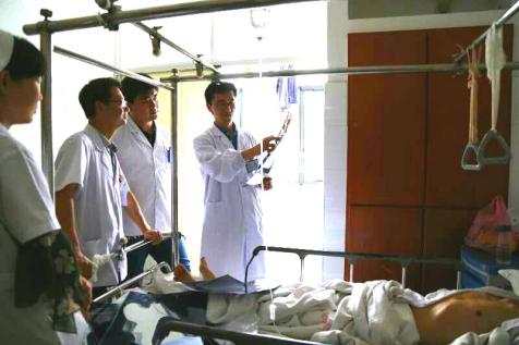 6月10日,骨科党支部冒着炎炎夏日走进泾县中医院,支部书记申才良主任医师带领骨科党支部党员在泾县中医院门诊进行义诊,徐洪港副主任医师在病房进行教学查房,并为1名外伤致三踝骨折、踝关节脱位亟需手术治疗的患者进行义诊手术。