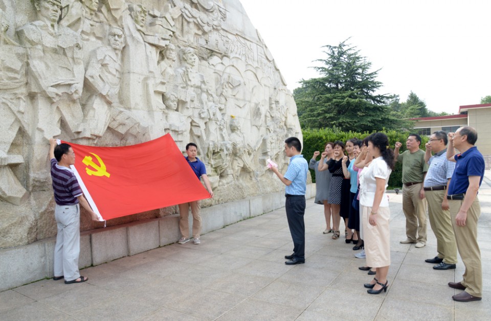 在庄严肃穆的纪念碑前,机关一支部全体党员面对鲜红的党旗,举起右手,在支部书记常进的带领下,集体重温了入党誓词:“我志愿加入中国共产党,拥护党的纲领……”一字一句,深深的镌刻在每位党员的心中。