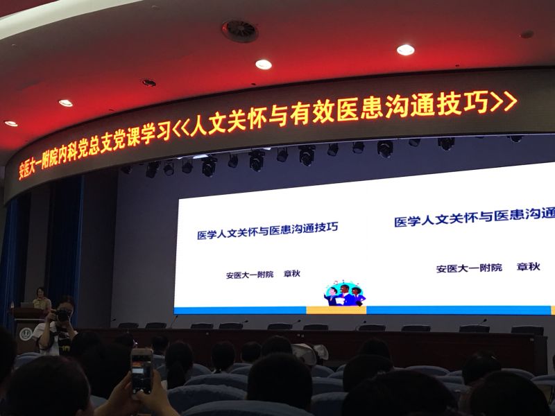 在党课会上,内科党总支书记章秋教授为全体党员作了《医学人文关怀与沟通技巧》的精彩演讲,她从医学人文的内涵及医学人文精神 、医学人文精神缺失的后果、人文关怀医护人员的必修课、医患沟通技巧四个方面进行了详细的阐述。特别是我们医务人员在平时的工作中要想提高医疗质量,最主要是要提高医务人员的人文素质;要想做到病人满意,就要做好医务人员与患者的有效沟通。