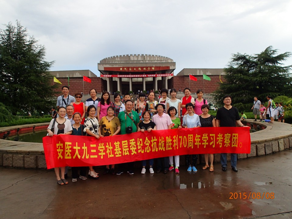 九三学社是民主党派中唯一以中国抗战胜利纪念日而命名的党派。为纪念中国人民抗日战争暨世界反法西斯战争胜利70周年,8月8日至9日,九三安医附院支社部分社员在九三学社安医大基层委副主委、支社主委李俊的带领下,赴山东台儿庄和微山湖学习考察,了解著名的正面战场台儿庄战役和共产党领导下铁道游击队打鬼子的历史,接受一次生动的爱国主义和革命传统教育。