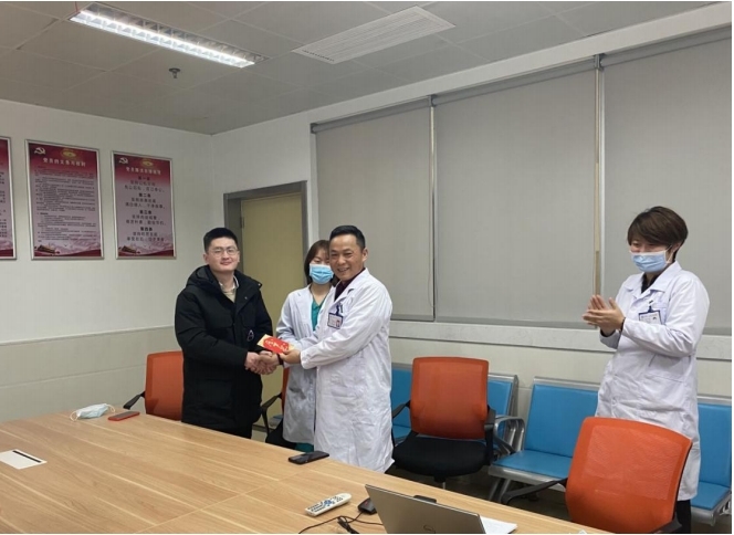 为认真落实习近平总书记关于民政工作的重要指示精神,我院开展以党支部为单位帮扶特别困难学生,为特困生提供帮助,促进其健康快乐成长活动。本次主题党日中最为特殊的一个环节是欢迎高新院区门急诊党支部结对帮扶的困难学生潘豪同学,潘豪与各位老师交流分享学习、工作经验,最后支部书记刘晔代表所有党员同志的爱心捐款 2000元交到潘豪同学手中。