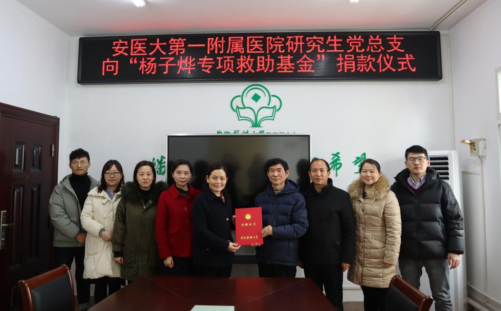 基金会理事长孙爱和向一附院研究生党总支表示感谢,并现场颁发捐赠证书。他表示,一附院研究生党总支成员捐赠爱心善款,是对杨子烨同学有力的支持,是对安医精神的传承,是播撒爱心、弘扬正气、宣传正能量的实际行动。