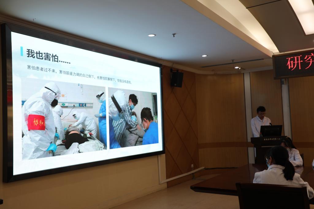 本次活动特别邀请“全国抗疫最美家庭”荣誉称号获得者、安徽省第四批支援湖北医疗队队员、我院高新院区急诊科董永鹏护师为支部全体党员以及入党积极分子讲述了“我的家国情怀”的微党课。2020年2月,在武汉疫情最紧急的时期,董永鹏和其新婚妻子(同为我院高新院区胸外科护师)不约而同主动请缨,申请援鄂,在春节举家团圆时刻,毅然于第一时间和新婚妻子携手奔赴武汉,在一个多月的抗疫中,是党员使命和家风底蕴给他们提供了战胜新冠病毒、克服生理、心理重重压力的不竭动力。武汉抗疫后,董永鹏护师不断学习思考,进一步提高自身的党性修养,对家国情怀有了更深的理解。