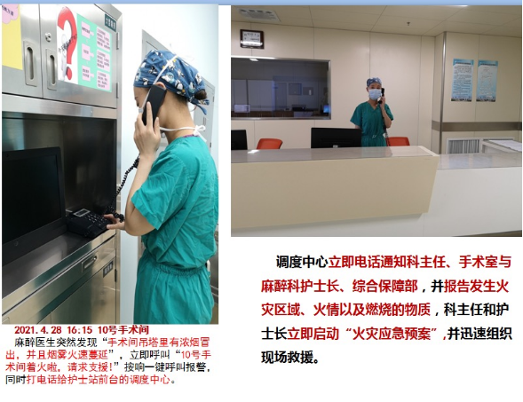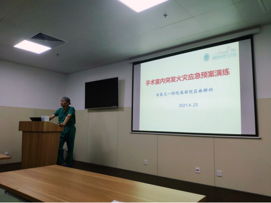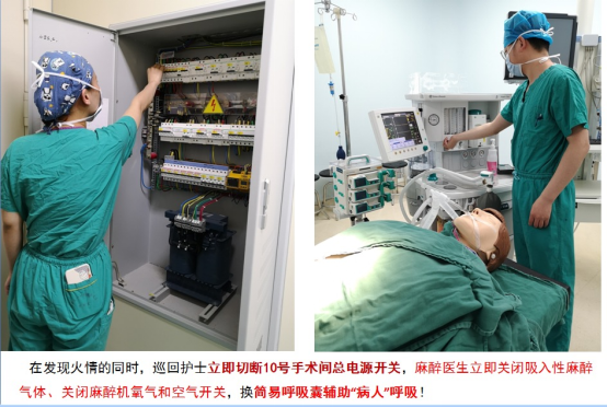 4月28日下午,麻醉科第二党支部在支部书记鲁显福和护士长王翠云的带领下,在手术室内组织了一场“突发火灾”(情景教学与模拟实训)的消防应急演练。
