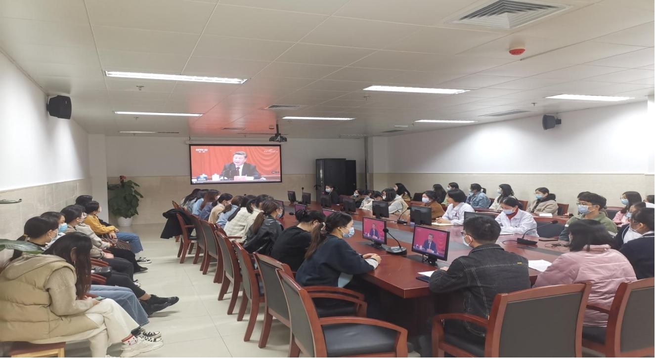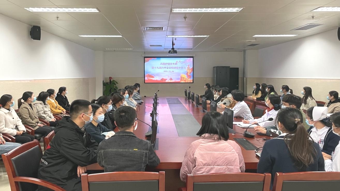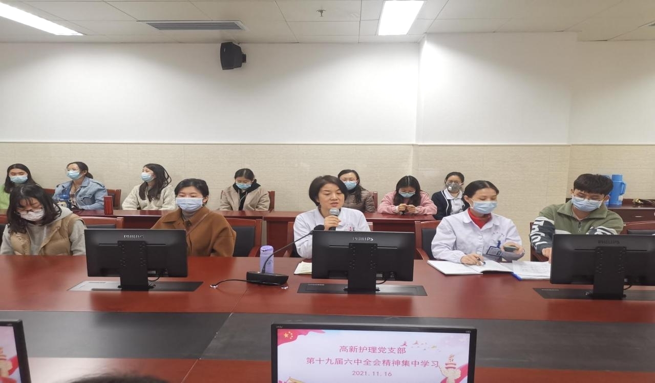 11月16日下午,高新护理党支部在科教综合楼第一会议室组织全体党员集中学习党的十九届六中全会精神,高新院区护理部主任、党支部书记韩江英主持会议。