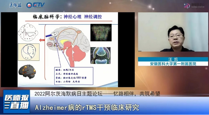 9月20日,神经内科汪凯主任医师以嘉宾的身份,参与“忆路相伴,共筑希望”2022年世界阿尔茨海默病日主题论坛,向全国共同致力于阿尔茨海默病研究的医师们进行了“Alzheimer病的rTMS干预临床研究”主题宣讲。宣讲中强调,阿尔茨海默症并非完全不可控制,只要采取适当的措施进行干预治疗,可以将疾病控制在可控范围内,一方面保障患者的生活能力,另一方面也帮助患者家属减少压力。