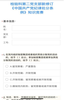 支部大会后,党支部组织委员陈鹤组织全体党员进行党纪学习教育知识竞赛,竞赛形式为线上答题,分为判断题和选择题两种题型,内容涵盖《中国共产党纪律处分条例》《中国共产党问责条例》《中国共产党党内监督条例》《中国共产党廉洁自律准则》和习近平总书记关于党纪学习教育的重要讲话和重要指示精神等,使全体党员以“竞”激发学习热情,以“赛”坚定理想信念,以“学”打牢理论基础,营造了遵纪学纪用纪的浓厚氛围。