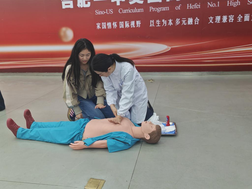 演示结束后,学生们踊跃上台练习,在专业人员的指导下,学生们第一次在模拟人身上做起了心肺复苏。医护人员们从场景的评估到按压的深度、频率再到气道的开放,手把手的教学,让在场师生充分了解掌握心肺复苏和使用AED的每一个关键步骤。