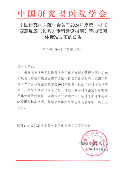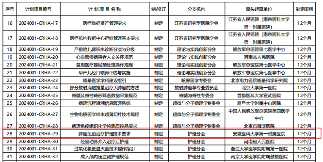 4月8日,中国研究型医院学会发布2024年第一批团体标准立项公告,由我院肿瘤护理团队完成的《肿瘤免疫治疗护理技术要求》团标准成功获批立项。