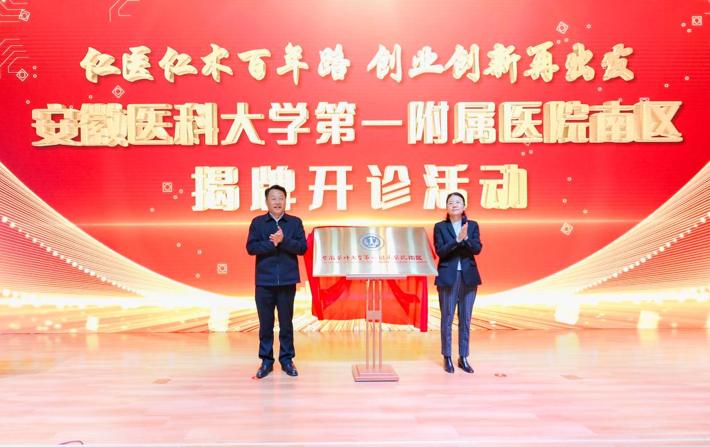 12月27日上午,我院南区举行揭牌开诊活动。时任省委常委、合肥市委书记虞爱华,副省长任清华出席并共同为“安徽医科大学第一附属医院南区”揭牌。