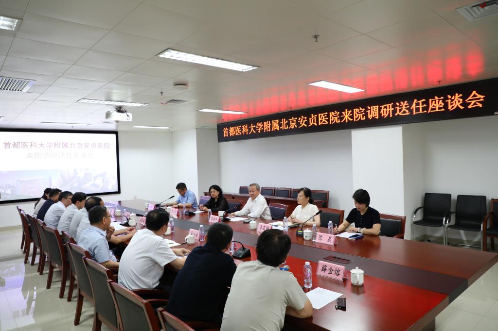 8月6日上午,医院在高新院区科教综合楼五楼第二会议室召开首都医科大学附属北京安贞医院来院调研送任座谈会。北京安贞医院副院长陈立颖、院长办公室主任陈晨,安徽医科大学校长翁建平,校党委副书记、医院党委书记徐朝阳,校党委常委、组织部部长、统战部部长李震静,医院院长孙倍成,党委副书记、副院长李阳新,副院长、高新院区党委书记、院长、安贞医院安徽医院党委书记陈旭林出席会议。会议由孙倍成主持。