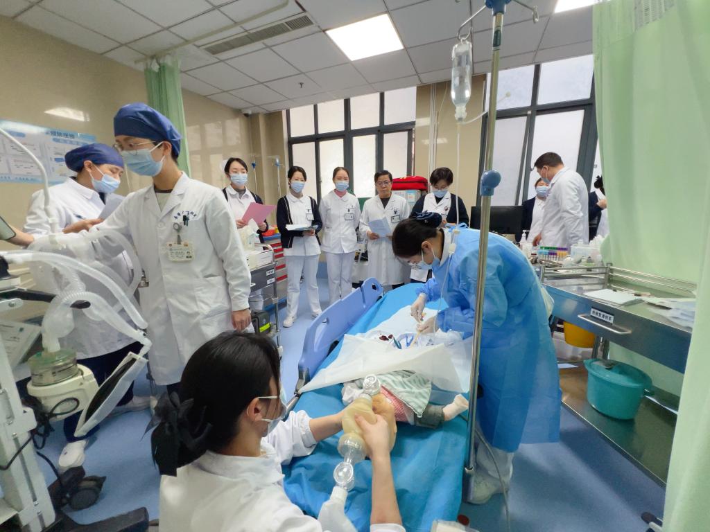 15:05,总指挥、南区院长助理邵友忠宣布演练正式开始。急诊抢救室内,医护团队迅速对危重伤员展开救治:生命体征监测、留置针静脉穿刺、创面保护、吸氧、保留导尿……针对患儿突发面色青紫、呼吸微弱、血氧饱和度测不出,医护立即配合完成人工气道建立、吸痰、呼吸机辅助通气;针对老年患者因家属为患儿而出现情绪激动、心率增快、血氧下降,护士及时给予心理护理与安抚。整个演练过程紧张有序,多学科协作流畅,伤员经紧急处置后安全转运至烧伤与创面修复外科。15:30,应急演练顺利结束。