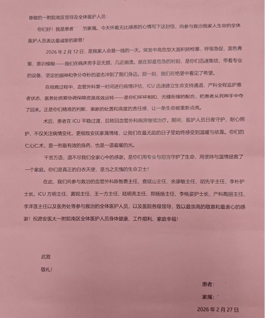 出院时,患者家属特意送来感谢信和锦旗,向所有参与救治的医护人员表达深深的谢意。他们表示,是医护团队的快速反应和专业精神,为患者争取了重生的机会。