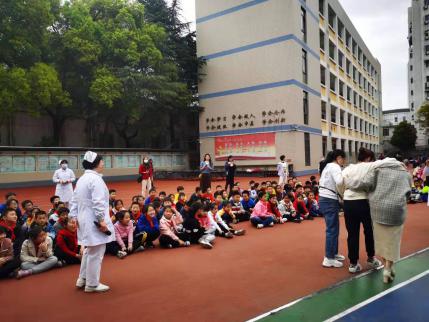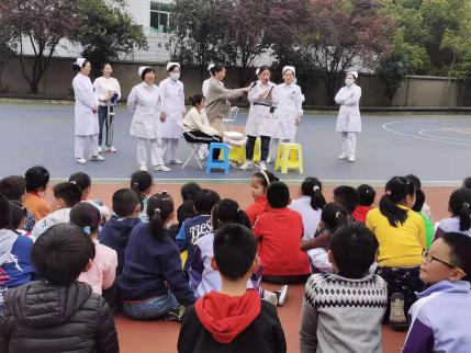 本次活动在护理部胡少华主任的支持和骨科甘玉云护士长的指导下,由骨科科普护理团队与南丁格尔志愿者约20余人共同参与完成。活动以情景剧形式,在现场进行了“崴脚了,怎么办”的演示,告诉他们崴脚后该如何正确处理。随后带领学生们一起跳健身操,现场100余位学生积极参加欢乐互动,并精心准备了玩具和学习用品,激发了学生们的活动参与和学习的热情。