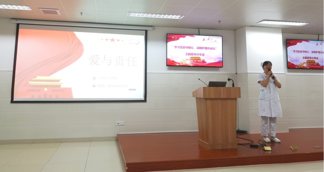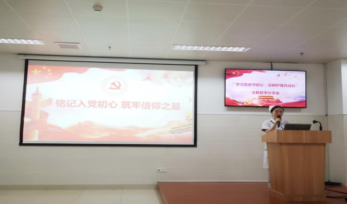 来自妇科二病区、重症医学科、心血管内科三病区、急诊科、护理部的5名党员代表和来自呼吸感染科的1名入党积极分子代表分别以《静心读党史,青春献给护理》、《学党史,强信念,跟党走》、《用心悟党史,用行践初心--我的入党之路》、《峥嵘岁月,初心不忘》、《激扬青春跟党走,一颗红心永向党》、《爱与责任》为题上台交流分享,他们或讲述党历史上的先锋模范人物,或描述家乡的红色历史,或回顾自身的入党之路和入党初心,或分享身边护理工作者的榜样故事,或深情讲述党员父亲的感人事迹,最后均落脚到护理工作,联系自身工作实际,对党史学习和工作职责的有效融合展开了深刻思考和经验分享。他们强调作为一名新时代的年轻党员应该时刻发挥党员先锋模范作用,秉持“功成不必在我,功成必定有我”的精神,不忘从事护理工作的初心和使命,用心服务、用爱护理。