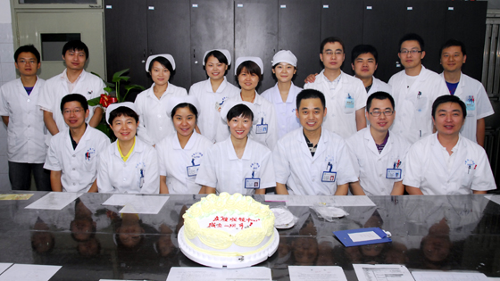 7月15上午,普外科八病区(腹腔镜外科)医院员工围着蛋糕庆祝病区成立一周岁的生日。