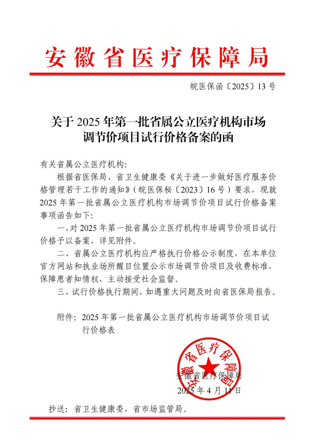 关于2025年第一批省属公立医疗机构市场调节价项目试行价格备案的函