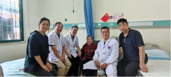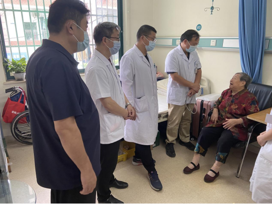 义诊结束后,医务处院际医疗管理部部长袁克勇、老年心内科柯道正主任、神经内科任于果主任、干部呼吸科王炯主任在西园街道卫生服务中心主任王永峰的带领下,来到康复病区看望“七一勋章”获得者马毛姐,听其讲述入党故事。专家们对马毛姐进行了体格检查和用药指导。马毛姐虽已是耄耋之年,但依然保持着健康向上的心态、乐观积极的精神,她对专家们的走访表达感谢,并表示将用自己的故事鼓励更多人努力学习,为党和国家多作贡献。