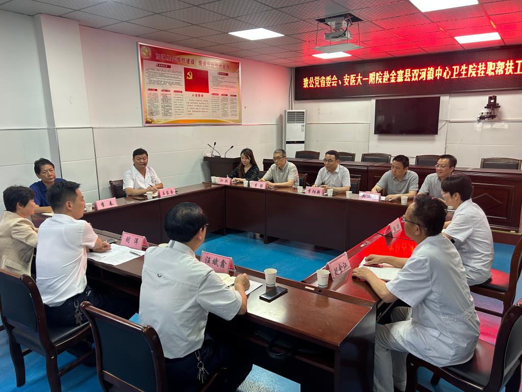 根据致公党安徽省委会商请,经致公党安医大基层委推荐,医院党委选派重症医学科副主任医师、致公党安医大基层委副主委许伦兵赴金寨县双河镇中心卫生院,开展为期一年的帮扶工作。6 月 6 日下午,医院党委副书记、副院长李阳新一行前往双河镇中心卫生院参加帮扶工作对接会。致公党省委会社联部副部长李强等参加会议,双河镇党委副书记、镇长刘洋主持会议。